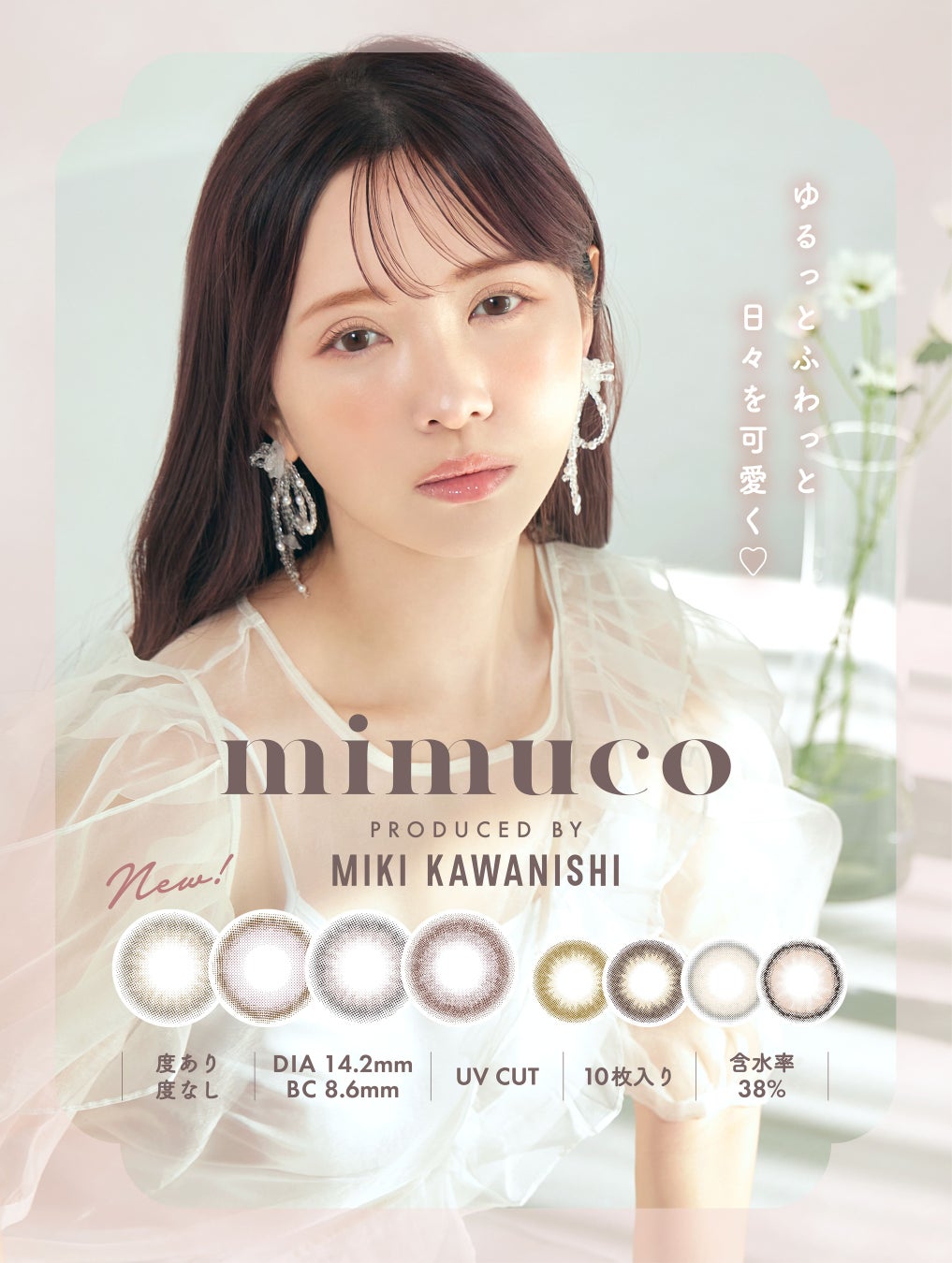 人気美容系動画クリエイターかわにしみきさんプロデュースカラコン『mimuco(ミムコ)』は、ブランド名の由来となっている「365日毎日使えるような、ナチュラルなレンズを」という思いのもと約2年にわたりデザインやカラーの改良を重ねて完成したレンズとなっております。