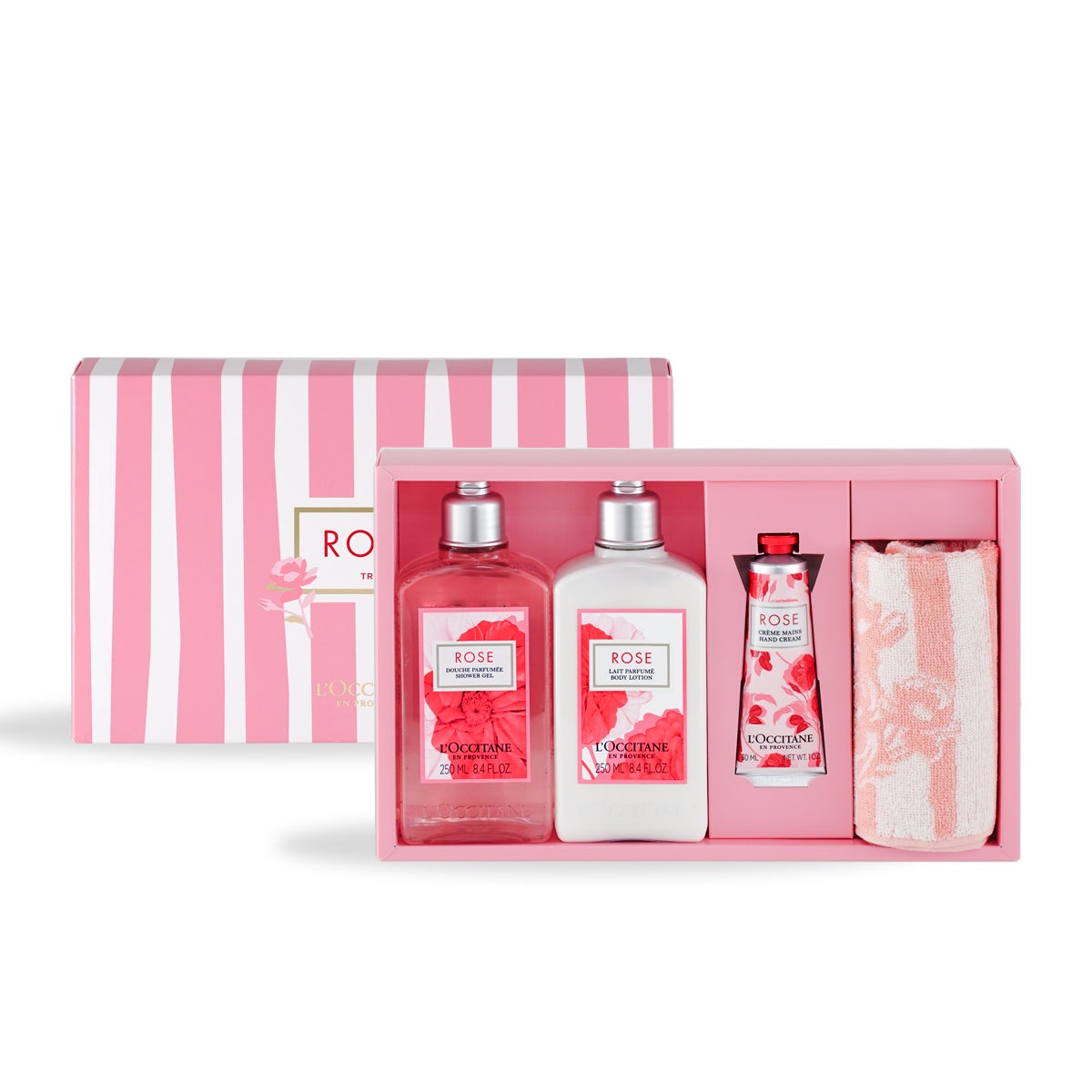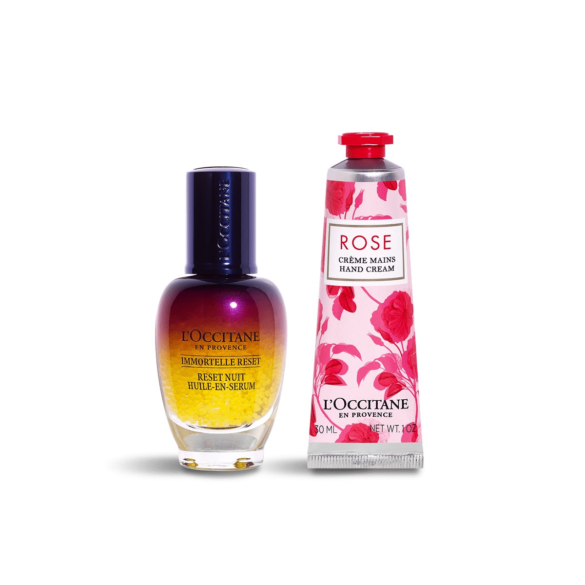 2つ目にご紹介するのは、「ローズ」シリーズのハンドクリームと、ロクシタンのスキンケア人気No.1*の夜用美容液「イモーテル オーバーナイトリセットセラム」が可愛いボックスに入った「リセット&ローズ」。寝ている間にお肌を集中ケアし、翌朝、熟睡した次の日のようなうるおい満ちた肌へ導く夜用美容液は、仕事や家事に忙しいお母さんに喜ばれること間違いなしのアイテムです。