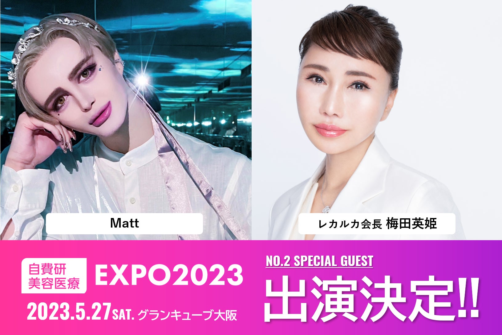 『自費研美容医療EXPO@大阪』スペシャルゲスト第2弾は、美容王子とも呼ばれるMatt(マット)さんと、レカルカ会長の梅田英姫さんです。