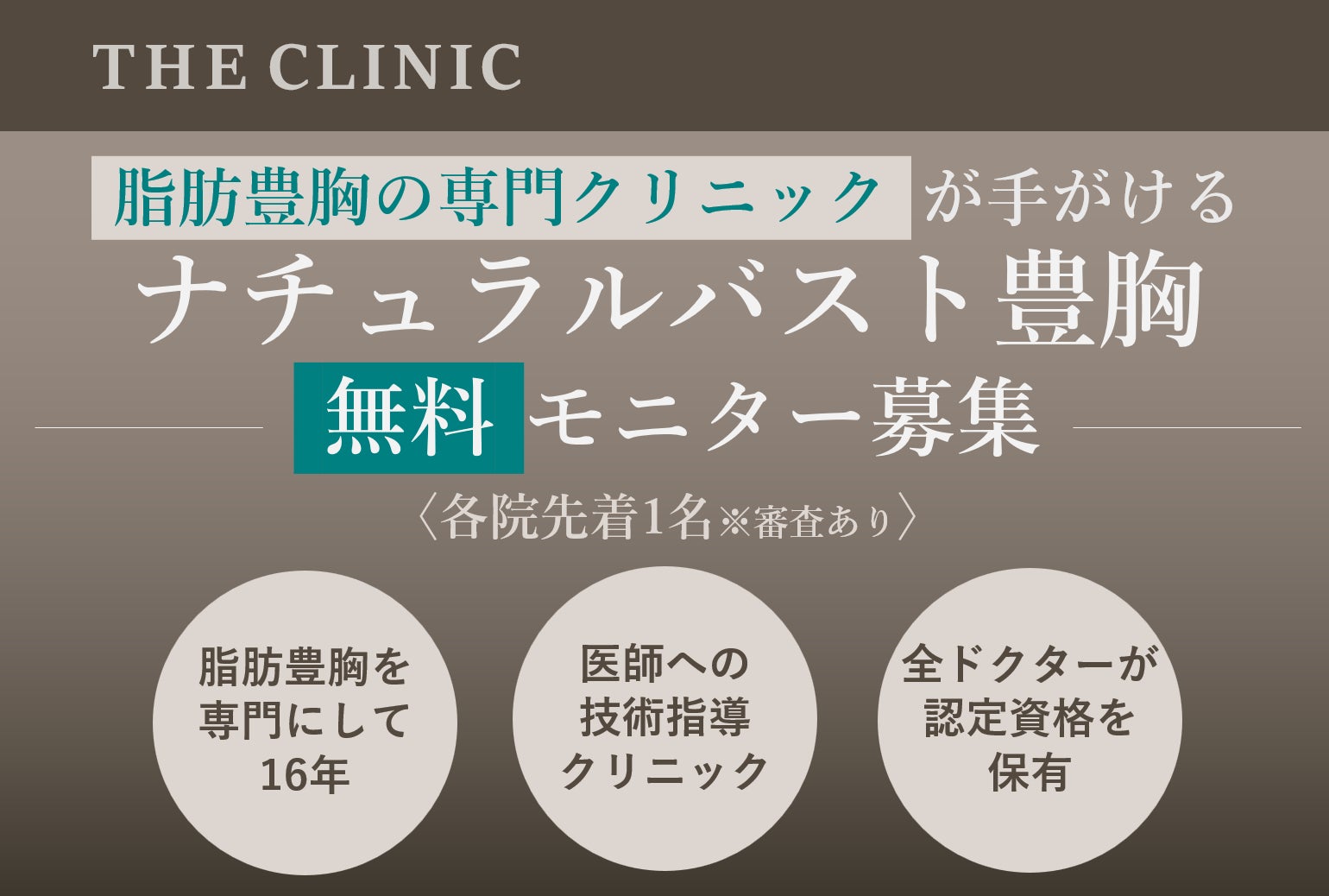 無料モニター募集に関する審査や条件の詳細情報につきましては、WEBサイト(https://www.theclinic.jp/feature/campaign-nb/)よりご確認ください。