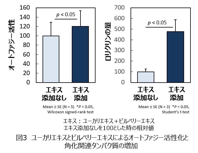 その結果、ユーカリエキスとビルベリーエキスを同時に添加した場合に、オートファジーの活性が上昇すること、また、ロリクリンタンパク質が増加することを確認しました(図3)。これらより、ユーカリエキスとビルベリーエキスを同時に添加することで、角化が整えられることが示唆されました。