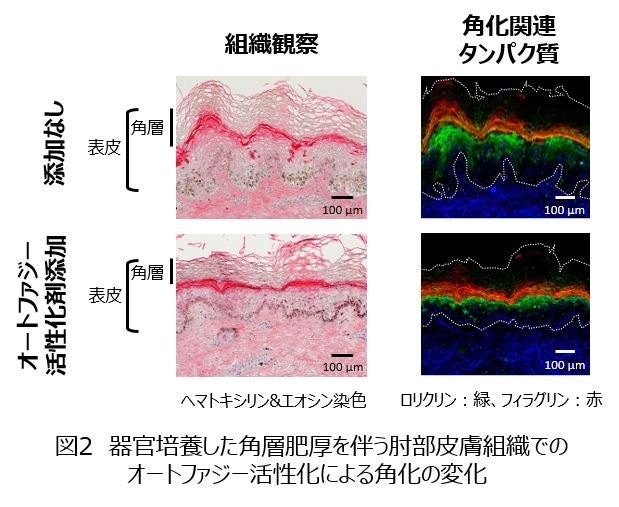 角化の乱れにオートファジーが及ぼす影響をより詳細に検討するため、器官培養した肘部皮膚にオートファジーを活性化させる試薬を添加し、表皮の角化の状態、角化に関連するタンパク質を可視化しました。その結果、角層の肥厚が抑えられ、角化に関連する不均一だったタンパク質の分布も整いました(図2)。