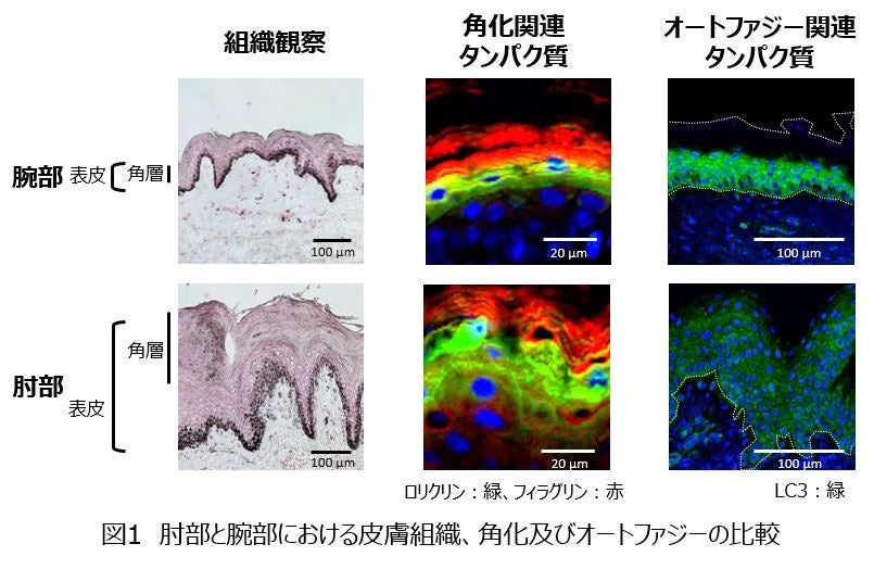 表皮の角化とオートファジーとの関連を詳しく調べるため、肘部に乾燥やざらつきなどの肌トラブルがある30~50歳代健常人を対象とし、肘部とその周辺の腕部の皮膚を比較しました※3。その結果、肘部において角質肥厚(角層が厚くなった状態)が認められました。また、表皮での正常な角化に重要な役割を有するタンパク質であるロリクリンとフィラグリン※4、LC3※5タンパク質を蛍光色素で染色し可視化した結果、それらの分布が著しく乱れていることがわかりました(図1)。また、肘部皮膚のLC3の代謝量は腕部の皮膚と比べて少なく、オートファジーの活性が顕著に低下していました。