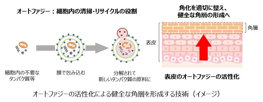 今回、花王は、常に古い細胞が新しい細胞と入れ替わる表皮においてもオートファジーが深く関わっていると考え、研究を進めました。表皮では、角化細胞が成熟して角層を形成する角化という過程が行われており、この過程で潤いに重要な成分が作られ、外部刺激から皮膚を守るためのバリア機能を獲得します。そのため、角化が正常に行われることは肌を健やかで美しい状態にするのに非常に重要です。