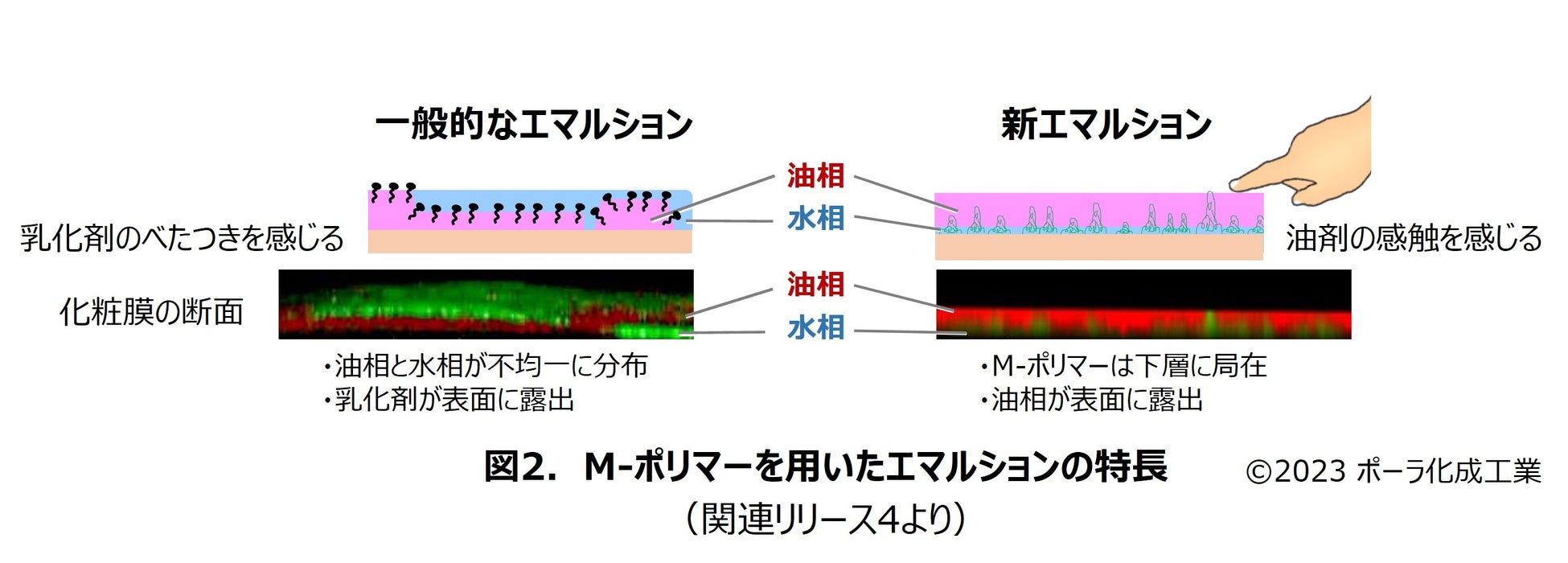 化粧水を塗った後のM-ポリマーの分布を制御し、まるでシルクのような柔軟感やエモリエント感を与える技術や、べたつかずに配合した油のエモリエント感を感触に活かしやすくする技術を開発。