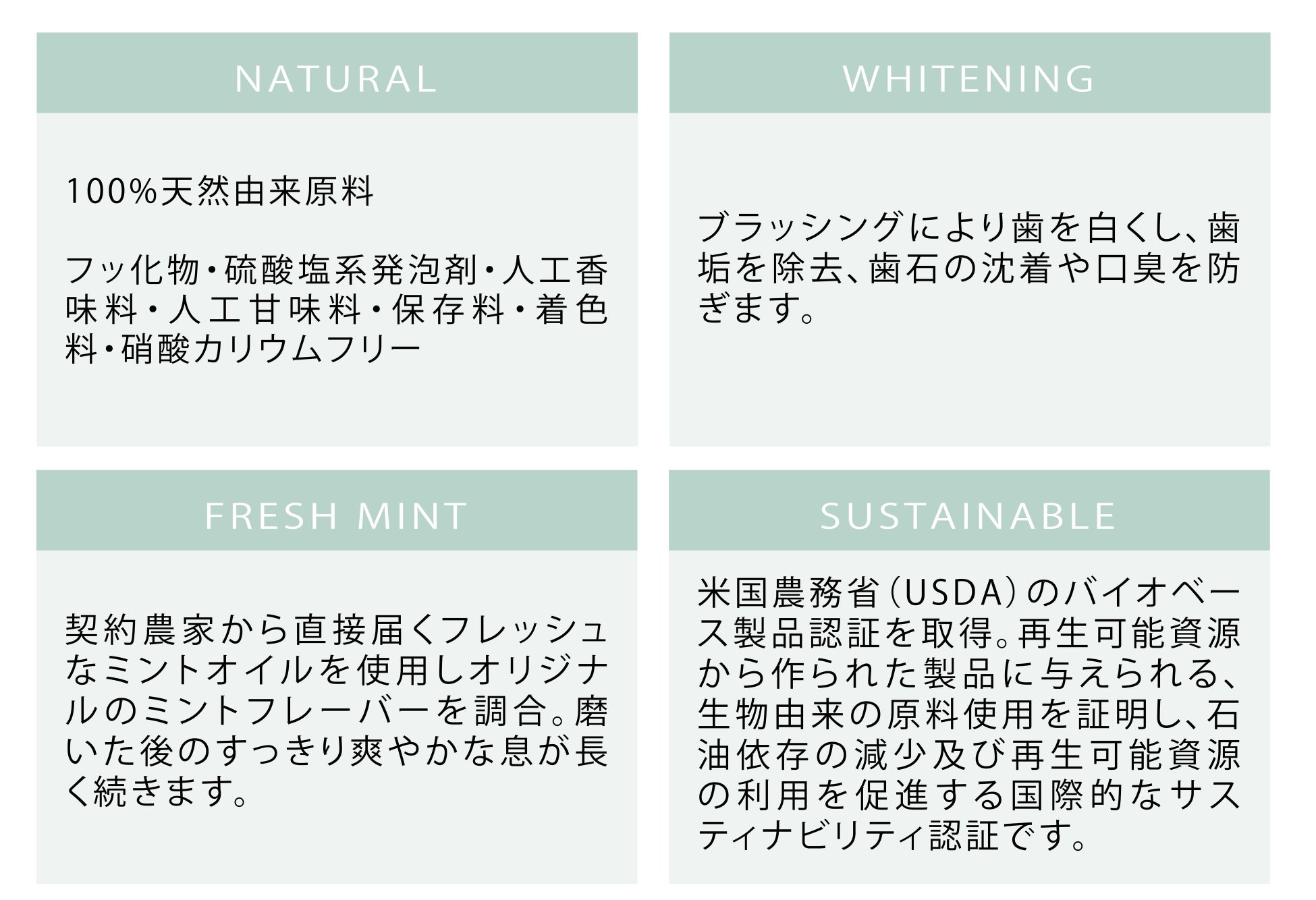 全成分:炭酸カルシウム、グリセリン/大豆由来、水、炭酸水素Na、キシリトール/樺の木由来、含水シリカ、ヒドロキシアパタイト、ココイルグルタミン酸Na/ヤシ油由来、カラギーナン/海藻由来、セイヨウハッカ油、スペアミント油、アニス種子エキス、ヒメコウジ葉油、ステビア葉/茎