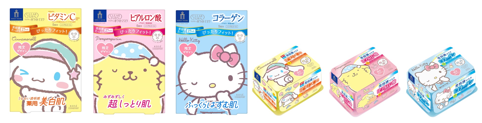 ビタミンC※2配合タイプには、「シナモロール」、ヒアルロン酸※3配合タイプには「ポムポムプリン」、コラーゲン※4配合タイプには「ハローキティ[K1] 」を採用。ウィンクした表情が愛らしい限定パッケージです。肌悩みに合わせて、また好きなキャラクターで選んでいただけます。
