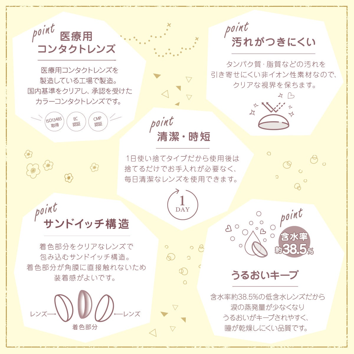 ふんわりとかわいい雰囲気から、きりっとクールまで、印象は自由自在。ナチュラルだけど、ナチュラル過ぎない「オトナカワイイ」にぴったりのカラーコンタクトです。