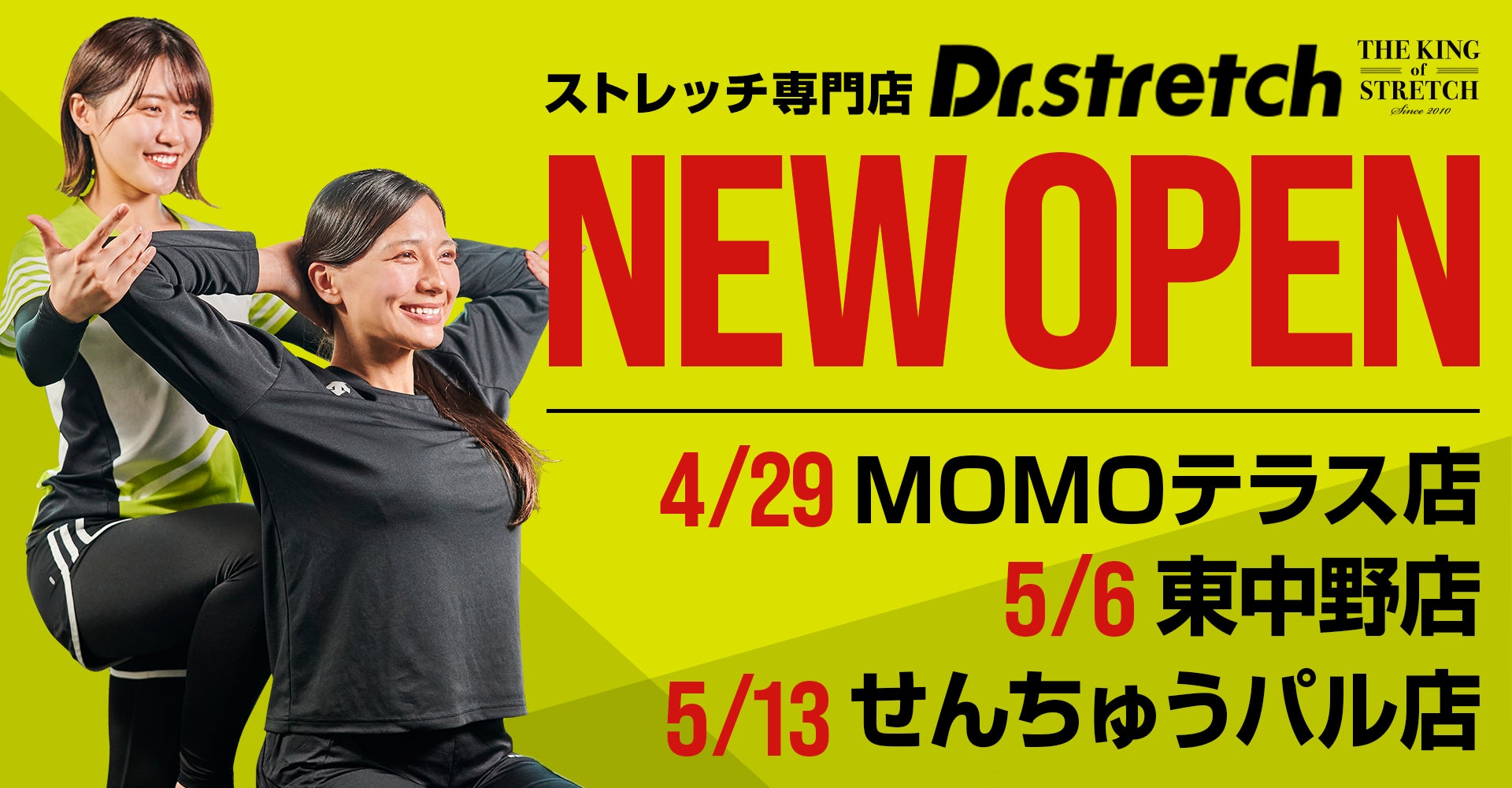 せんちゅうパル店は、5月13日にオトカリテ内の「千里中央店」からせんちゅうパル2階に移転オープン致します。Dr.stretchでは、プロアスリートからも支持される独自技術「コアバランスストレッチ」を導入しており、自分一人では伸ばしきれない奥深くの筋肉までプロのトレーナーがしっかりアプローチする為、多くの皆さまの身体をサポートいたします。