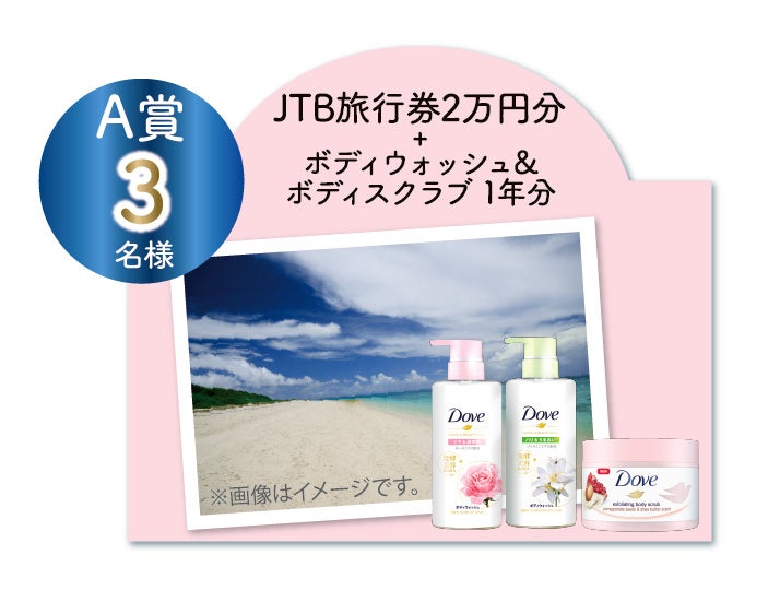 ダヴ 発酵&ビューティーシリーズ ボディウォッシュとダヴ クリーミーボディスクラブ両方の購入とレビュー投稿で、抽選で3名様に「本気透明肌セット」(発酵&ビューティーシリーズ ボディウォッシュ&クリーミーボディスクラブ1種類ずつ)各1年分と、手に入れた透明肌を生かせる夏の旅行にもぴったりなJTB旅行券2万円分が当たる。