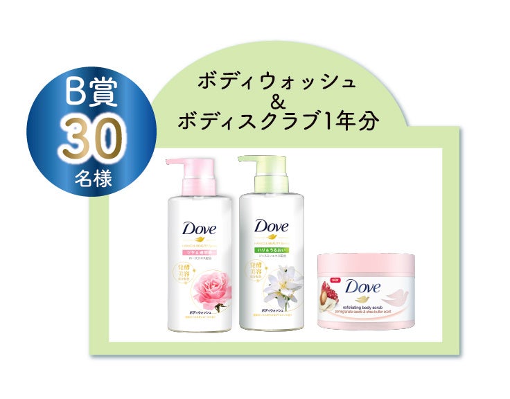 ダヴ 発酵&ビューティーシリーズ ボディウォッシュ、または、ダヴ クリーミーボディスクラブの購入とレビュー投稿で、抽選で30名様に「本気透明肌セット」(発酵&ビューティーシリーズ ボディウォッシュ&クリーミーボディスクラブ1種類ずつ)各1年分が当たる。