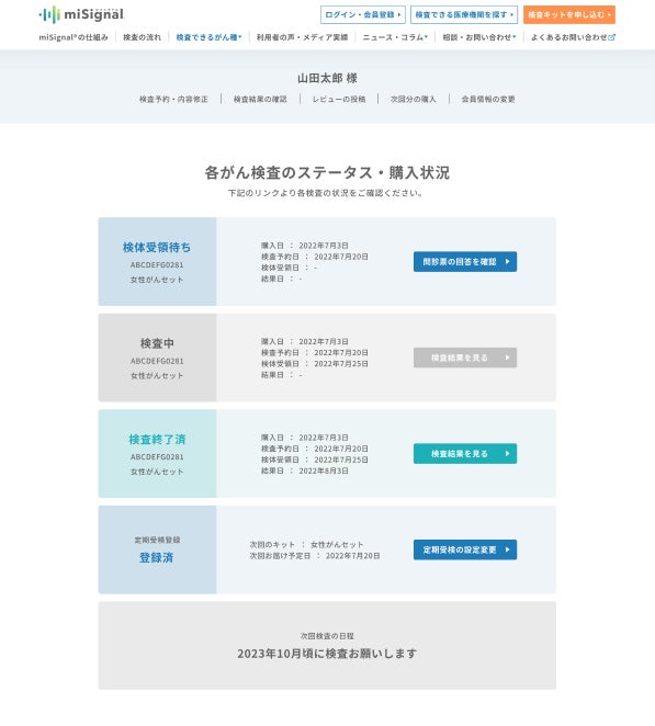 そこで、専用サイト上に「マイページ機能」を実装することで、マイページ内で検査の進捗状況を把握できる他、自身の検査結果票を確認することができるなど、検査を受ける際の利便性が向上します。