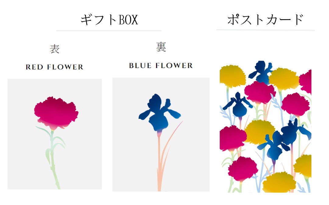 ギフトBOXは、母の日の定番であるカーネーションと父の日を想起させるブルーが綺麗なアヤメをモチーフに、シーンや相手に応じて使い分けられる裏表プリントを施しました。ポストカードにはマリーゴールドも加え、腸内フローラが「Flora(花畑)」と言われるように、美しい花が集まり花畑となる様子を描きました。腸内フローラは多様性が高いほど、理想的と言われています。細菌の種類が多くバランスよく存在している健康的な腸内フローラであるように。そんな想いがポストカードには込められています。