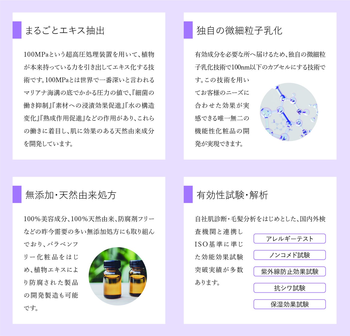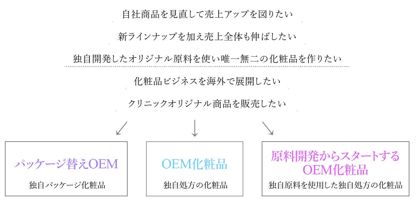 お客様のオリジナル化粧品(PB)を長年開発・製造してきたベル・クール研究所は既存のラベル替えOEMと、処方を一から組み立てるOEM化粧品事業に加え、現在高まる唯一無二の差別化された商品のニーズに対し、独自の新規化粧品原料開発からスタートするOEM化粧品事業を展開しております。