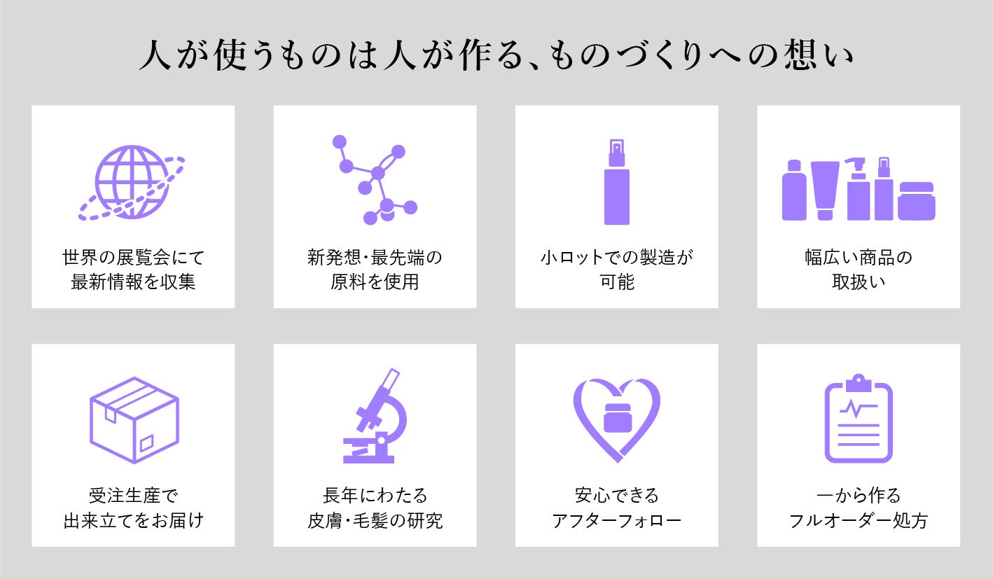 店販品10個、業務用3個からOEMを受け付けております。職人技術やノウハウによって、 お客様のご要望に応じたオリジナル化粧品を製造するだけでなく、薬機法についてのご指導など、製品を発売するまで多方面からサポートいたします。