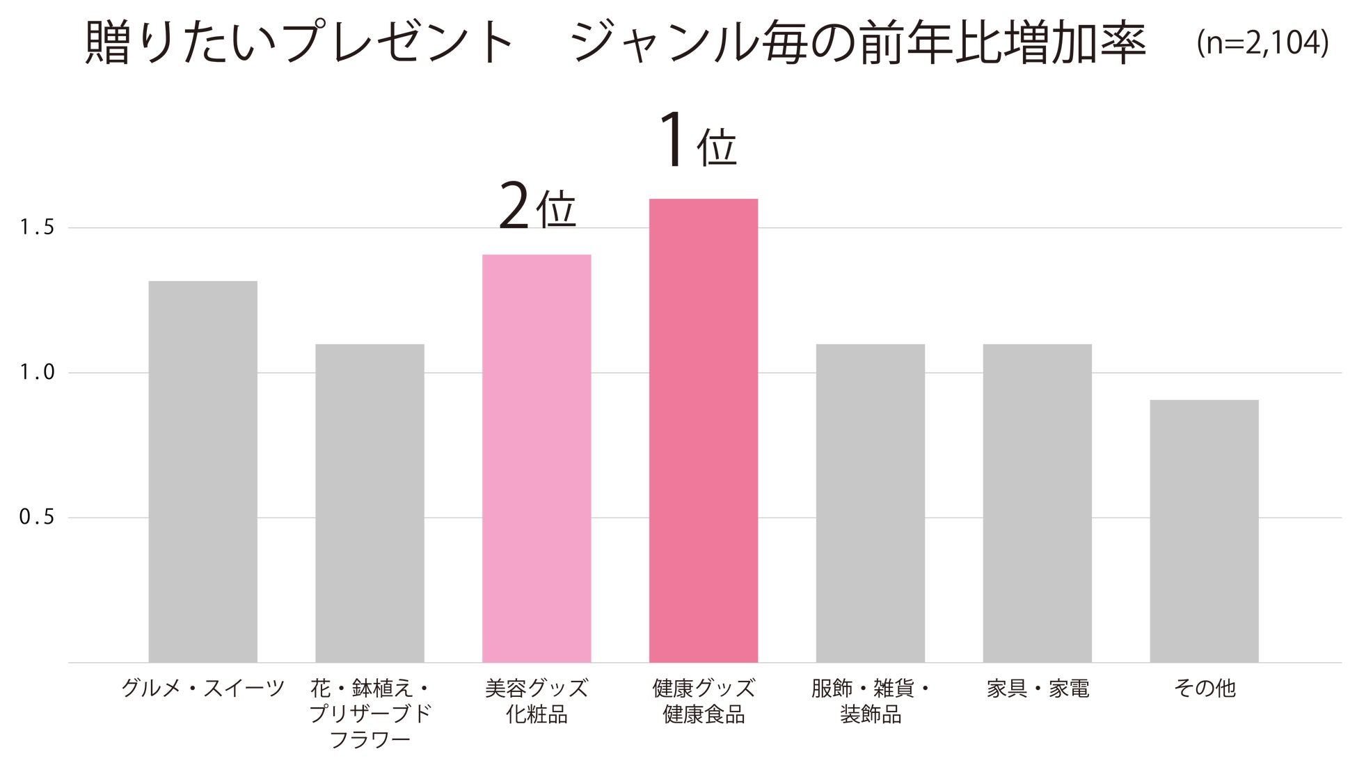 まず、20〜40代の女性2,104名に調査をしたところ、昨年に比べて母へ贈りたいプレゼントとして最も増えているジャンル1位に「健康グッズ」、2位に「美容グッズ」が選ばれました。