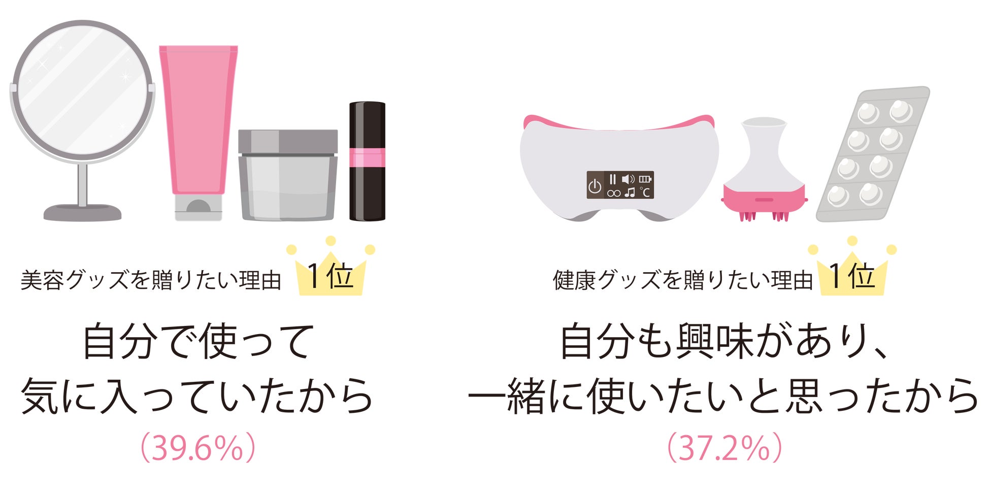その理由には、「過去にもらったことがあり、嬉しかったから」という声が多く、「普段、自分で買わないような物を選んでくれるから」「美容に力を入れているから」「健康になりたいから」という声も。