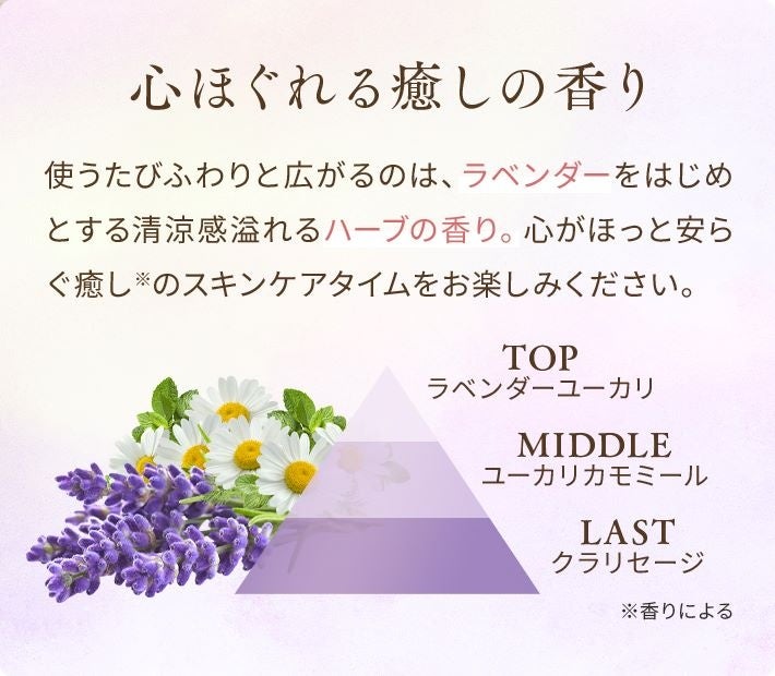 使うたびふわりと広がるのは、ラベンダーをはじめとする清涼感溢れるハーブの香り。心がほっとする安らぎのスキンケアタイムをお楽しみください。