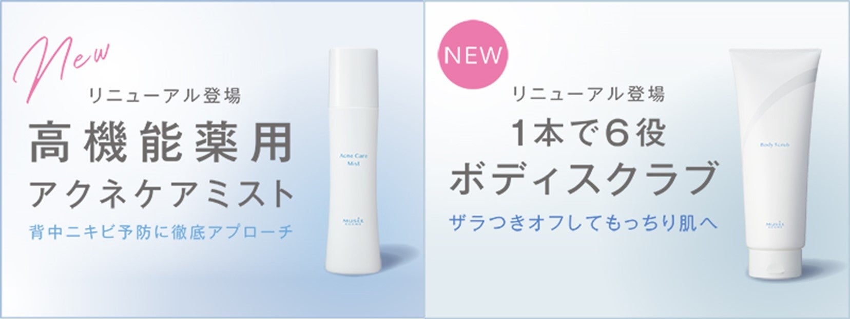 角質ケアに適した「ボディスクラブ」は、2014年より発売し、これまでに累計100万本以上を販売(2023年3月時点)。お客さまだけでなく、ミュゼスタッフからの満足度も高い大人気商品です。今回リニューアル発売する「ボディスクラブ」は、脱毛期間中のデリケートな肌にもご使用いただけるのはもちろん、ヒアルロン酸やダイズ種子エキス、ミュゼ独自成分mufla(ミュフラ)(※4)とエピコントロールEX(※5)をW配合し、角質をケアしながらうるおいを与え、理想の美肌へ導きます。また、これまで配合していたマンナンスクラブ(※6)、マイクロスクラブ(※6)(セルロース)に加え、2種類のスクラブ剤、重曹(炭酸水素Na)(※6)とアロエベラ葉(※6)を追加。ボディソープだけでは落としきれない古い角質や毛穴汚れをやさしくオフし、ミルクのような質感でより心地よい使用感を目指しました。さらに、「薬用アクネケアミスト」「ボディスクラブ」ともに、脱毛サポート成分(※7)で、脱毛効果(※8)の出やすい肌へ導きます。脱毛中の肌ケアにピッタリなボディケア商品で、ご自宅での肌ケアをお楽しみください。
