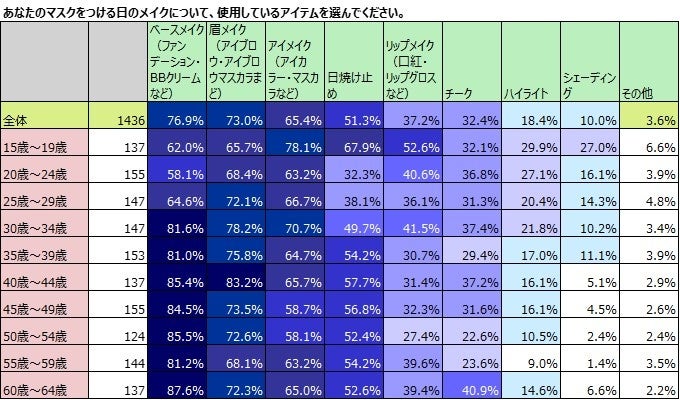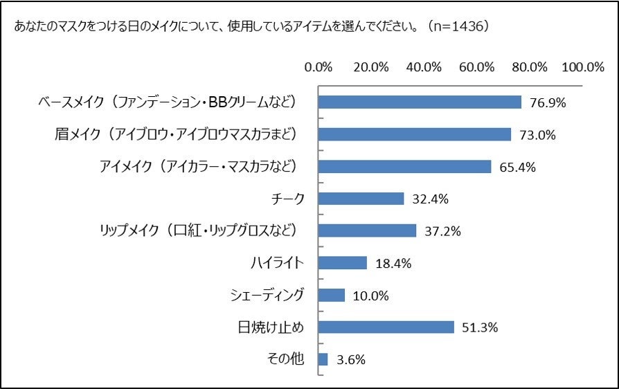 また、マスクをつける日にメイクをしている1,436名に使用しているアイテムを選んでもらいました。ベースメイクを使用している人が76.9%で最も多く、眉メイク73.0%、アイメイク65.4%と続きます。次に続くのが日焼け止めで51.3%です。口紅・リップロスなどマスクをすることで完全に隠れてしまう口元のメイクを使用していたのは、37.2%と4割を切りました。