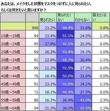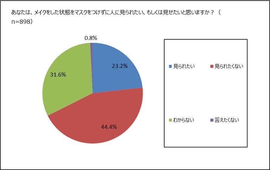 マスクをする日にメイクをしていると答えた898名に、メイクをした状態をマスクをつけずに人に見られたい、もしくは見せたいと思うか否か聞きました。全体では44.4%と半数に近い人が「見られたくない」と答えています。「見られたい」は23.2%で、「わからない」31.6%よりも下回りました。