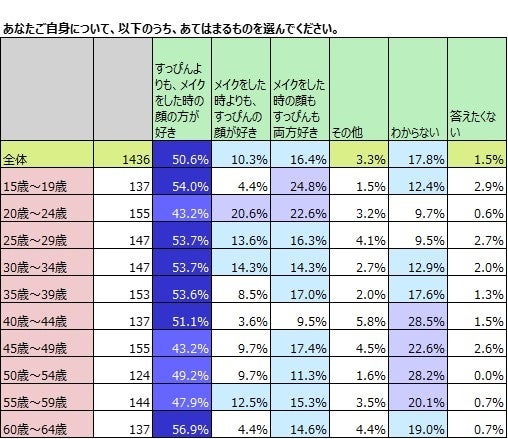 全体では50.6%と半数を超える人が、「すっぴんよりもメイクをした顔の方が好き」と答えています。「メイクをした時よりもすっぴんの方が好き」と答えたのは10.3%と約1割。「メイクをした顔もすっぴんも両方好き」の人は16.4%でした。 これを年齢別に見てみると、「すっぴんよりもメイクをした時の顔の方が好き」と答えている人は、全世代で40%台の半ばから50%台の半ばにあてはまり、年齢による意識の差はほとんどないことがわかりました。「すっぴんよりもメイクをした顔の方が好き」が最も多かったのは60歳~64歳で、次に多いのが15歳~19歳です。若年層でも高齢層でも変わらない割合でメイクをしている顔の方が好きと答えていることは興味深い結果です。「メイクした顔もすっぴんも両方好き」と答えた人が多いのは15歳~19歳で24.8%、20歳~24歳で22.6%と、2割を超えるのは若年層でした。