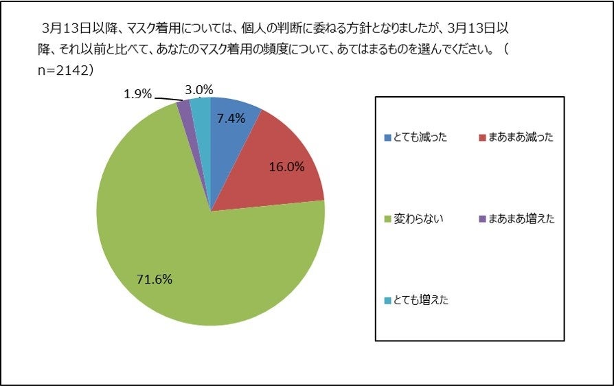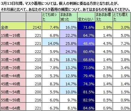 ① マスク着用頻度、「変わらない」が7割超。50代以上は8割超が、「変わらない」。