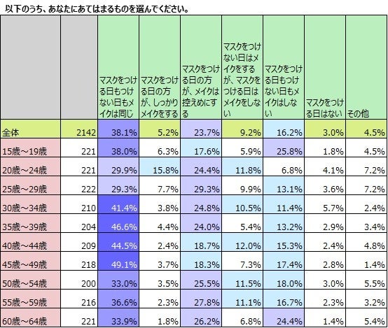 マスクをつける日とつけない日で、メイクが異なるか否か聞きました。マスクの着用の有無に関わらず同じと答えた女性は38.1%と約4割。「マスクをつける日のメイクは控えめにする」が23.7%と約2割。「マスクをつけない日はメイクをするが、マスクをつける日はメイクをしない」9.2%と合わせると32.9%で、マスクをつけることによってメイクの使用意向が減る人が3割以上です。年齢別で見てみると、「メイクは同じ」の割合が多いのは30代~40代で、いずれも4割を超えています。20歳~24歳では「マスクをつける日の方がしっかりメイクをする」と答える人が15.8%で、マスクをつけている時でも見えている目元や、マスクによってメイク崩れしやすい口元や頬などのメイクに注力していることがわかります。
