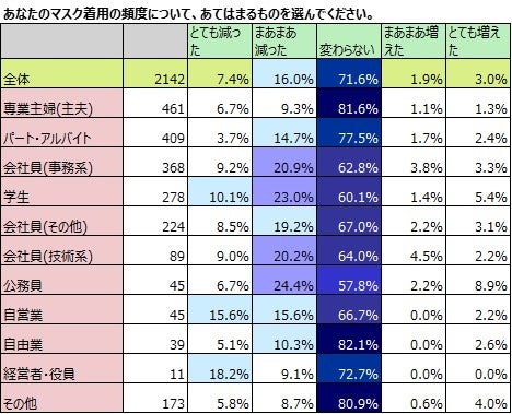 また、マスクの着脱の頻度・変化は、その人の所属する環境によっても傾向が見られるのではないかと思い、職業別でも見てみました。n数が少ない職業もあるので参考値になりますが、「変わらない」が最も多いのは「自由業」で82.1%、続いて「主婦」81.6%でした。「とても減った」と「まあまあ減った」を合わせた「減った」のが最も多いのは、「学生」で33.1%です。「減った」のが少ないのは、「自由業」15.4%「主婦」16.0%と、「変わらない」人と一致しました。当社の予想では、会社員や公務員など組織によって着脱のルールがある可能性の高い職業の人の方が「変わらない」と答える人が多いのだろうと予想していましたが、「自由業」や「主婦」など、組織のルールがないであろうと思われる環境の人の方が、「変わらない」人の割合が多いことに驚きがあり人目を気にする意識が垣間見えました。