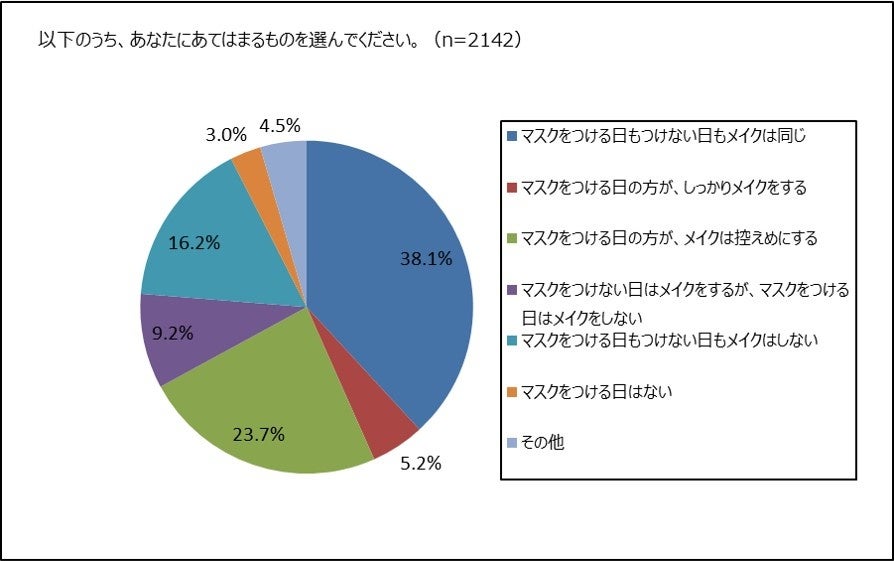 ③ マスクをつける日のメイク、「普段と同じ」約4割。「メイクは控えめ」約2割。「メイクはしない」約1割。