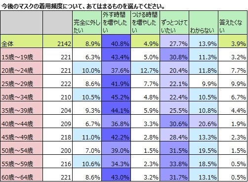 「減った」のが多いのは、20歳~24歳で、「とても減った」14.0%、「まあまあ減った」25.8%とどの年代よりも多く、「減った」と答えた人を合わせると39.8%と4割に迫ります。この世代は「変わらない」と答えた割合も全世代で最も少なく、48.4%です。反対に「まあまあ増えた」「とても増えた」と答えている割合が多いのもこの世代で、11.7%と1割以上の人が着用機会が「増えた」と答えており、個別で聞き取りを行うと、周囲で外す人が増えた分、自分の着用機会を増やしたという人が存在しました。