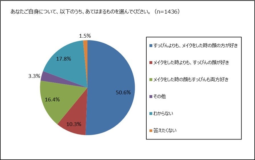 マスク着用の有無に関わらずメイクをしないと答えた人を除いた1,436名に、ご自身のすっぴんとメイクをした顔のどちらが好きか聞きました。