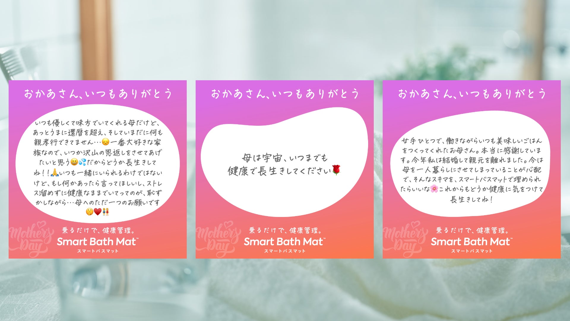 国内初商品(※1)のお風呂上がりに乗るだけで体重測定など自動で健康管理ができる「スマートバスマット」を提供する、ヘルスケアスタートアップのissin株式会社 (本社:東京都⽂京区 代表取締役:程 涛、読み:イッシン、以下「issin」)は、5月14日(日)の「母の日」を前に、「スマートバスマット」をお試しできる​​”120日トライアル”を実施します。