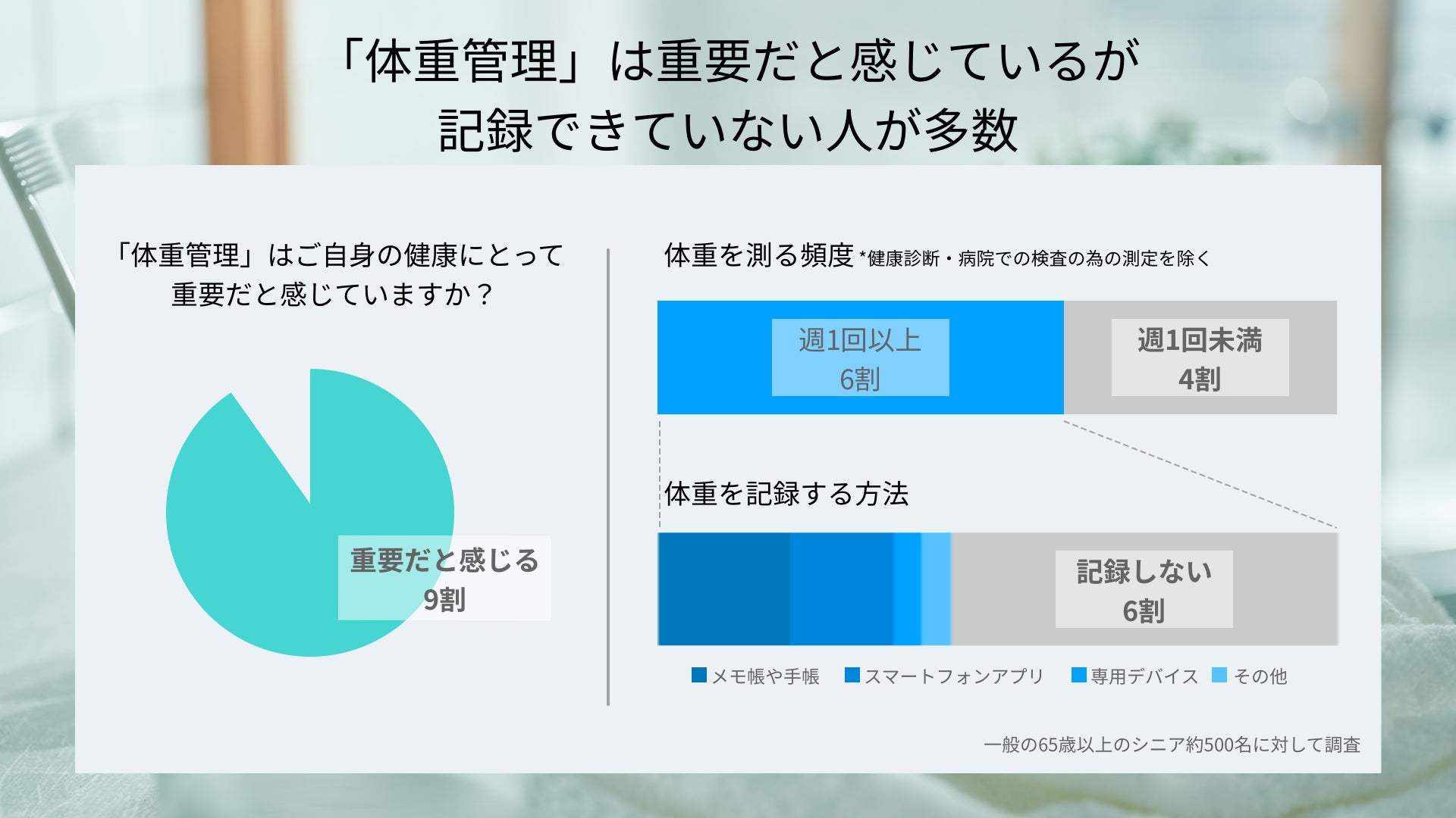 一方、一般の65歳以上のシニア約500名に対して調査したところ、「体重管理」は自身の健康にとって重要だと感じている人は9割、週に一回以上体重測定している人は6割いるものの、測定結果をいかなる形でも記録していない人が6割と、体重の記録管理ができていない実態が明らかになりました(※1)。
