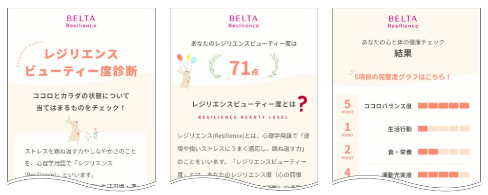 調査結果から、変わりめ期の女性をサポートするためには、まず自身の状態を知っていただくことや知識を深め安心してもらうことが大切と考え、ココロとカラダの状態やバランスを見える化できる「レジリエンスビューティー度チェック」をリリースいたします。