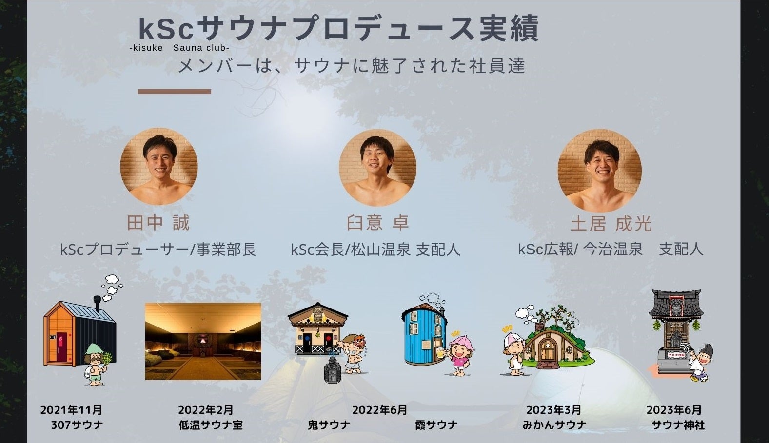 この理念のもとに、当社のサウナ好きのメンバーが立ち上がり、2021年4月に結成されたのが「kSc」-Kisuke Sauna club-です。サウナの魅力にすっかりハマった事業部長の田中誠氏を発起人に、「サウナの魅力や楽しさを世の中に広めたい!」という強い思いを持つ3人によって始動し、①サウナ情報・魅力の発信、②快適なサウナ環境の整備、③地域への貢献という3本柱を原則として、特色あるサウナ開発と、エンターテイメントを意識した独自のイベントを開催しています。