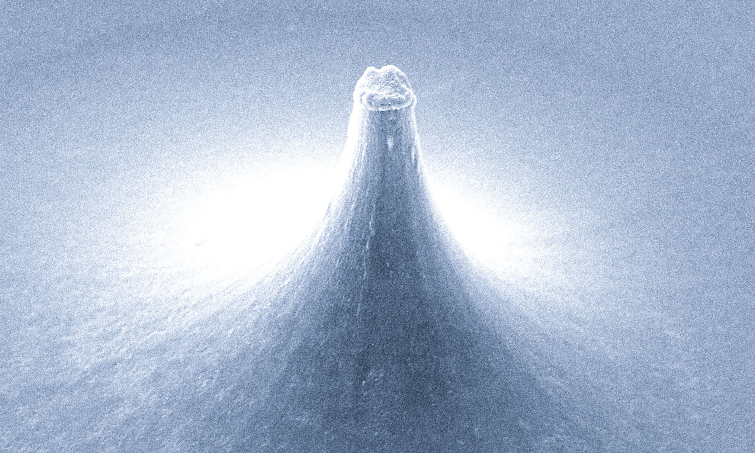 そこでコスメディ製薬では、肌の弾力に負けずきちんと刺さって成分が届くよう針の形状を徹底的に研究。針先端部は細く確実に角質層に穿刺でき、角質層内に針が留まり続けられるよう細い先端部を支える土台を持つ、独自の「富士山型のマイクロニードル形状」にたどり着きました。
