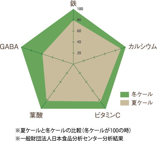 ケールの栄養を余すことなく摂るために、一年で最も糖度が上がるケールの旬である冬に収穫。夏ケールと冬ケールではここまで栄養価に違いが出ます。