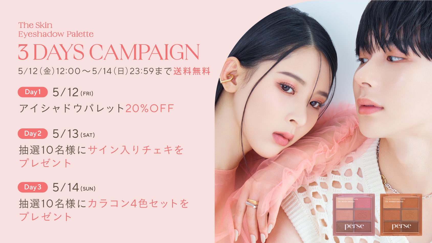 『The Skin Eyeshadow Palette』を送料無料かつ20%オフで購入いただける「DAY1」を皮切りに、“よしミチ”のサイン入りチェキが10名様に当たる「DAY2」、「perse」で発売しているカラーコンタクトレンズの全色が10名様に当たる「DAY3」と続きます。