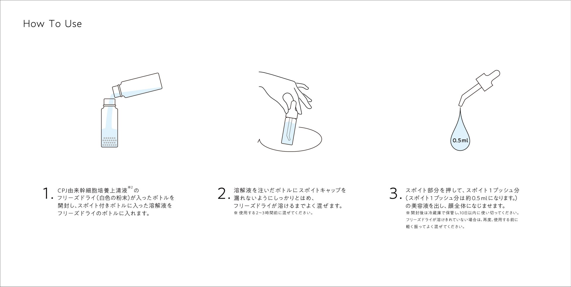幹細胞培養上清液※2 は、牛乳や卵と同じ、たんぱく質が主成分。そのため、 常温で保管するためには防腐剤や滅菌処理かが必要となります。私たちは、最もフレッシュなカタチで上清液を使っていただくため、上清液をフリーズドライ (凍結乾燥)したものと溶解液を別でパッケーシジング。10日間の消費期限のフレッシュな美容液を作ることができきるようにしました。溶解液でフリーズドライ化した上清液を溶かして10日間冷蔵庫で保管しながら使用してください。