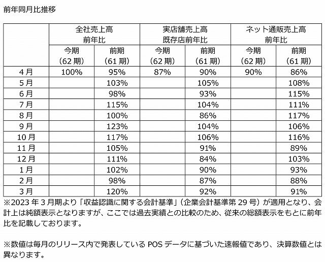 株式会社セキド(本社・東京都新宿区、社長・関戸正実、証券コード:9878)は、2023年4月度(3月21日~4月20日)の売上高が、全社の前年比100%、GINZALoveLove実店舗の既存店前年比87%、ネット通販の前年比90%となりました。なお、数値はPOSデータに基づいた速報値であり、決算数値とは異なります。