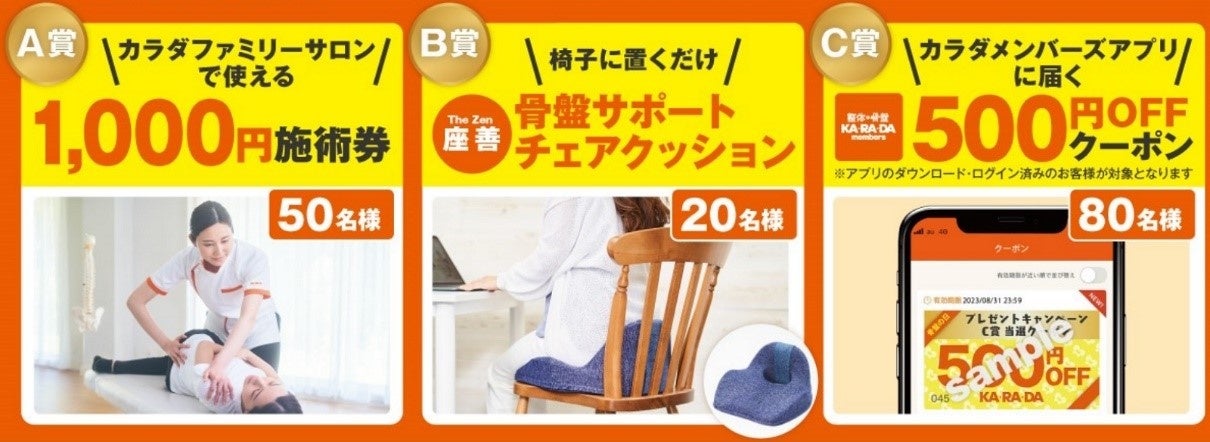 今年は、クイズに答えて楽しく骨盤ケアを知っていただくことを目的に骨盤クイズを出題します。WEBサイト・公式アプリから骨盤クイズにご参加いただいたき、全問正解された方の中から抽選で150名様にカラダファミリーサロンで使える「施術割引券」又は「骨盤」セルフケア商品をプレゼントいたします。
