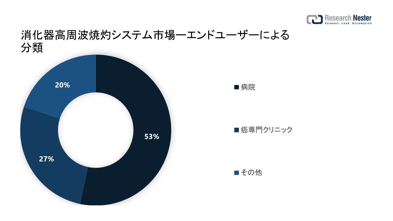 世界の消化器高周波焼灼システム市場は、外科腫瘍学、疼痛管理、心臓学および心調律管理、美容学、婦人科などへのアプリケーションによって、需要と供給について分割および分析されています。胃腸システムの 6 つのアプリケーションのうち、外科腫瘍学セグメントは 2035 年に最大の市場シェアを獲得すると推定されています。このセグメントの成長は、世界中で癌の有病率が増加していることに起因する可能性があります。高周波アブレーションは、特に結腸、肝臓、および膵臓癌の治療のために、手術を補完するものとして外科腫瘍学で頻繁に利用されています。2040 年までに、世界中で 16百万人以上が癌で死亡し、年間 29百万人以上が新たに癌に罹患することになります。