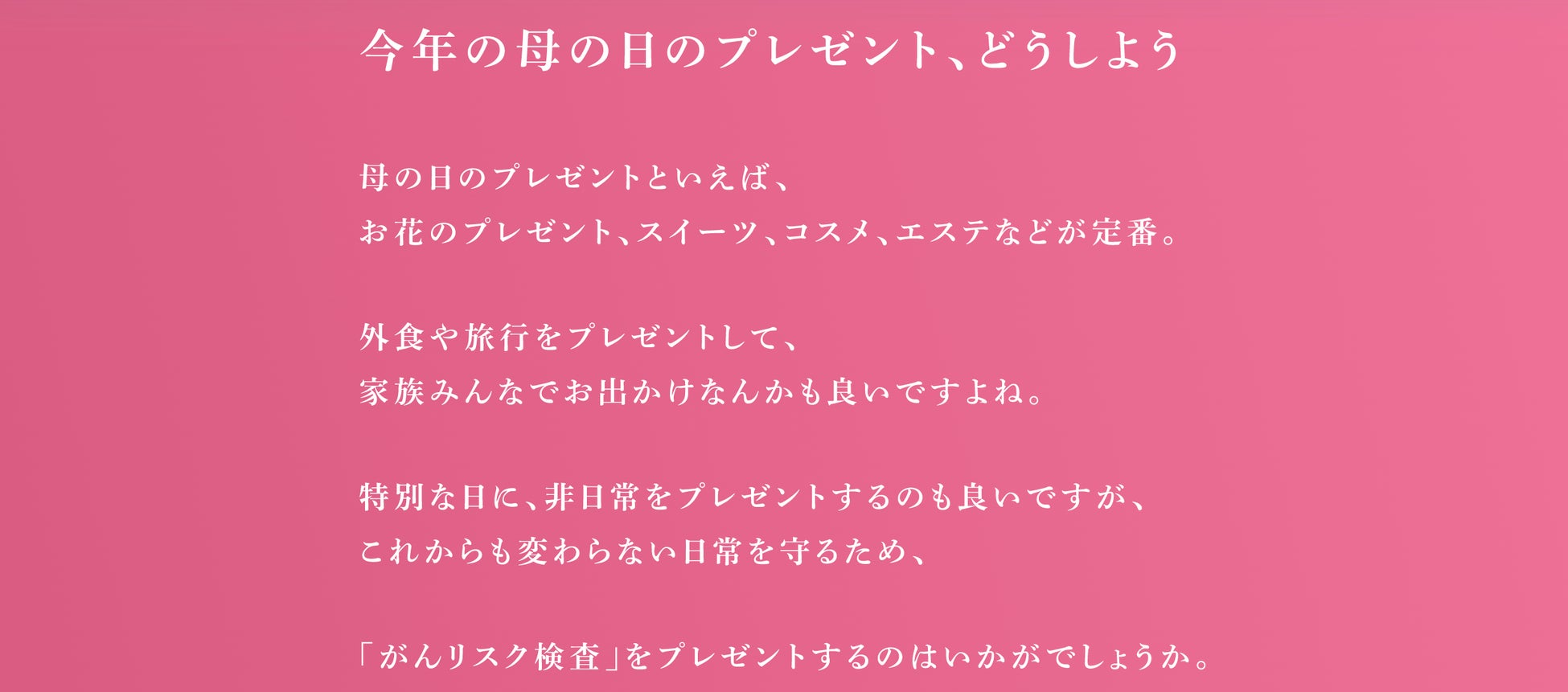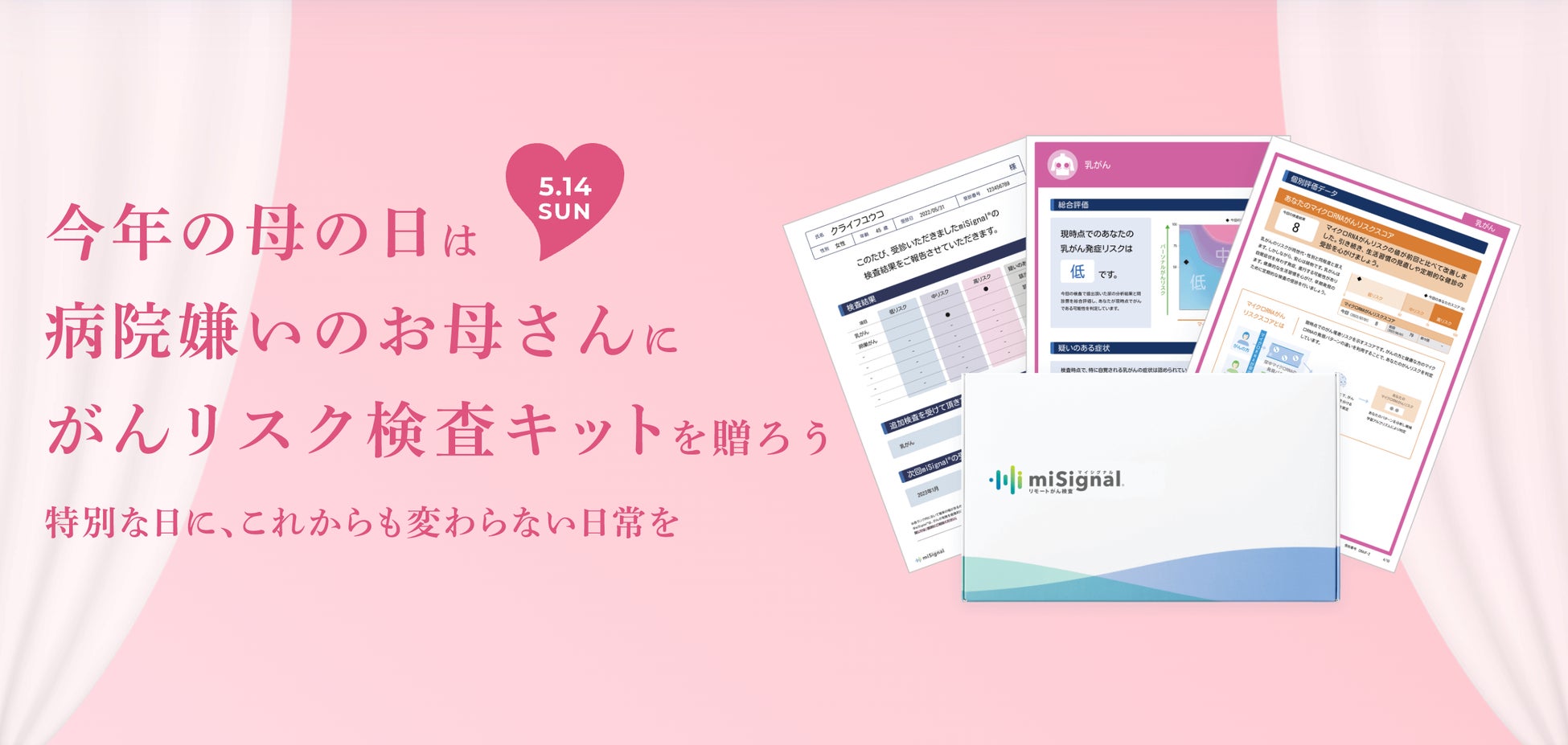 いつも家族のことを優先して自分のことは後回しにしているお母さんに、これからも健康でいてほしいと思う人は多いはず。母の日のプレゼントといえば、お花やスイーツ、コスメ、旅行などが定番ですが、1年に1回の特別な日だからこそ、Craifは健康に関するプレゼント「マイシグナル®︎リモートがん検査」を提案します。