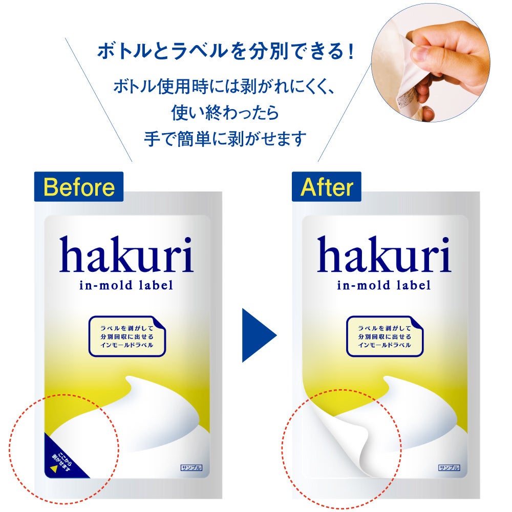 インモールドといえば、容器と一体成型することで剥がれにくいという特性をもつラベルですが、剥離インモールドラベルは耐水性・耐油性・耐薬性・耐摩擦性・優れた印刷再現性・加飾性を保ちつつ、手で容易に剥がすことが可能です。