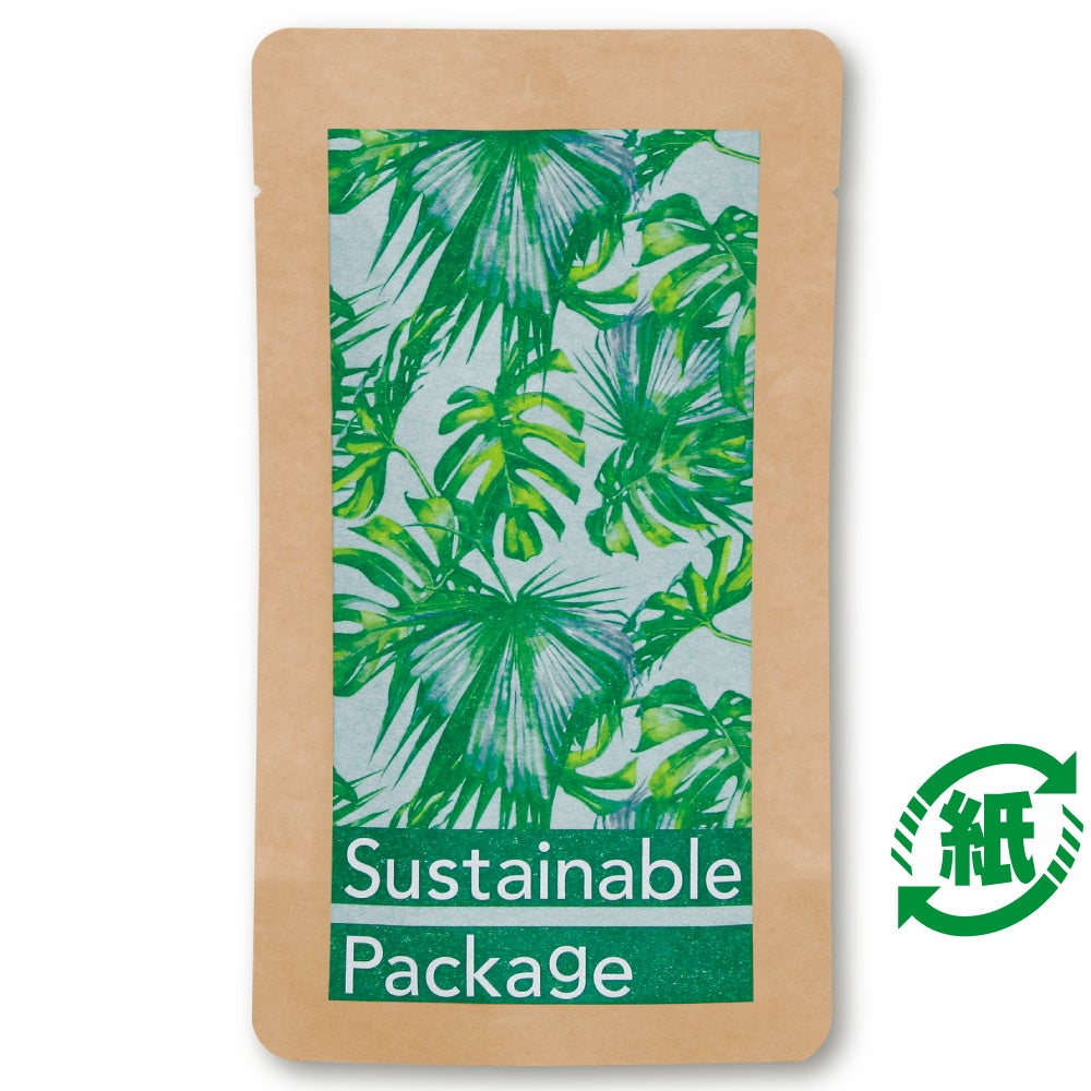 一般的なラミネート紙は、ヒートシール素材にPP(ポリプロピレン)やPE(ポリエチレン)を用いた多層構成ですが、本製品の場合、プラスチックを使用しない紙だけの単層構成です。化粧品・食品・日用雑貨などの二次包装として、ご使用いただけます。リサイクル識別表示マークは紙となります。