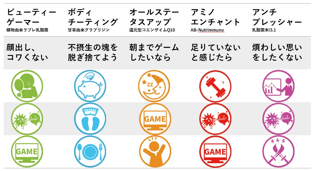 今や全国で5000万人といわれるオンラインゲーマーの日常生活について取材を重ね、彼らには日頃からとても負荷がかかっていることを知りました。待ちかねた新作が発売したら会社を休んでプレイに励む人もいるくらいエキサイティングでありつつ、夜更かしをしてしまう、長時間同じ姿勢で画面を見続ける、ご飯もろくに食べずにゲームを続ける‥という人は珍しくありません。かたやプロゲーマーは海外のプレイヤーと対戦するために夜型生活を送っていたり、筋肉疲労を抱えていたりします。楽しいはずのものが楽しめない。そうならないよう、ゲーマーにしっかりとした栄養補助食品を届けたい。そんな願いを込めて商品化しました。