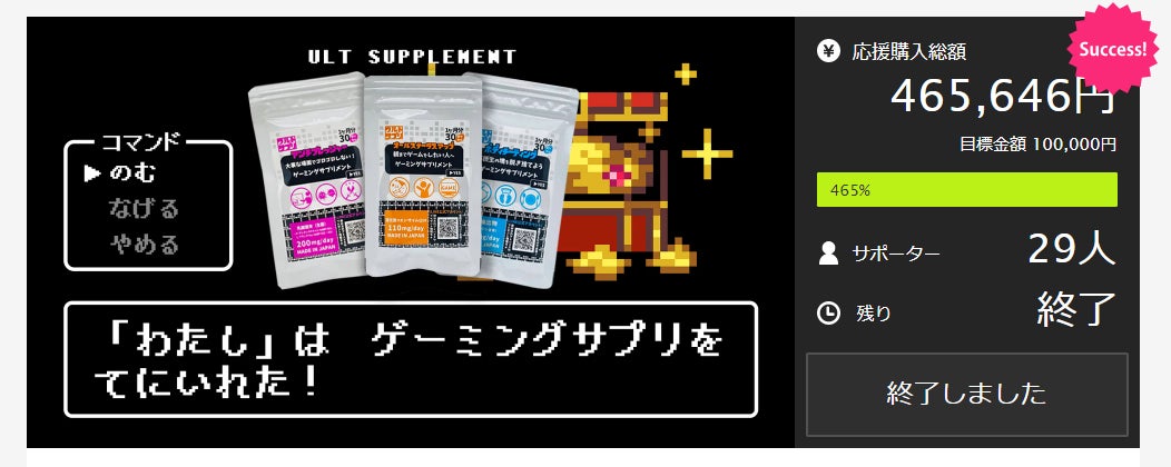 当商品は不摂生ゲーマーの健康負荷に着目した、新しいコンセプトのサプリメントです。「ゲームを朝までプレイしたい」「でも明日も仕事(学校)だし‥」そんな寝不足ゲーマーにおススメのウルトサプリは、格闘ゲームのプロライセンス保持者を中心に活動中のeスポーツチーム「還元型PROJECT」公認商品としても展開中です。