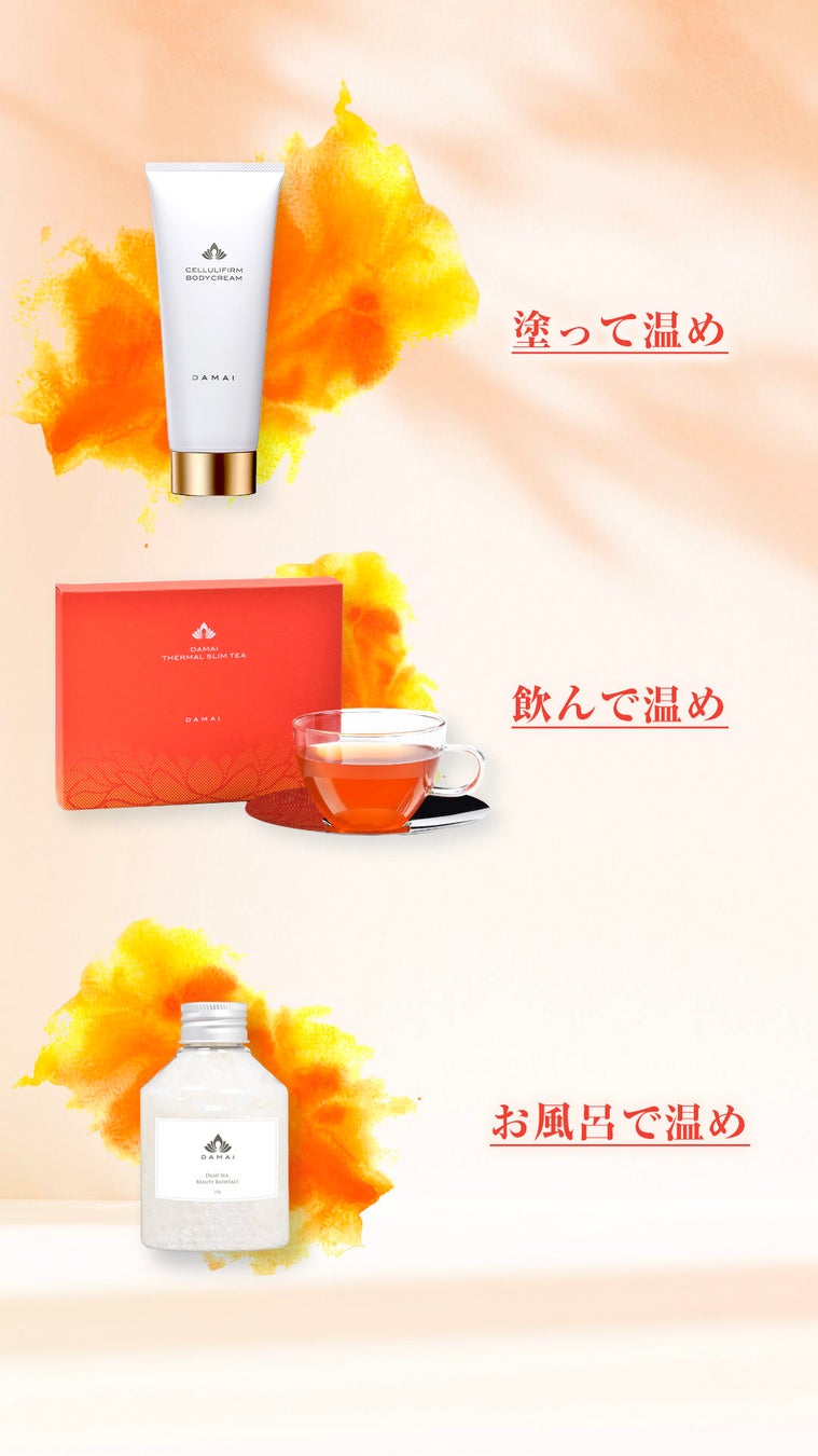 『D-Method(ディー メソッド)』は、「温め」「巡り」「排出」を促す ダマイ独自のコンセプトである“サーマル フィト セラピー”をご自宅のお手入れでも体感していただくために、ボディケア・フェイスケア・ネイルケア製品全てに付属しています。これによりプロ仕様のホームケアが可能となります。