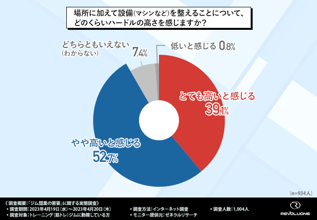 そこで、「場所に加えて設備(マシンなど)を整えることについて、どのくらいハードルの高さを感じますか?」と質問したところ、『とても高いと感じる(39.1%)』『やや高いと感じる(52.7%)』『どちらともいえない(わからない)(7.4%)』『低いと感じる(0.8%)』という結果となり、実に9割以上の方が、マシンなどの設備を整えることはハードルが高いと考えていることがわかりました。